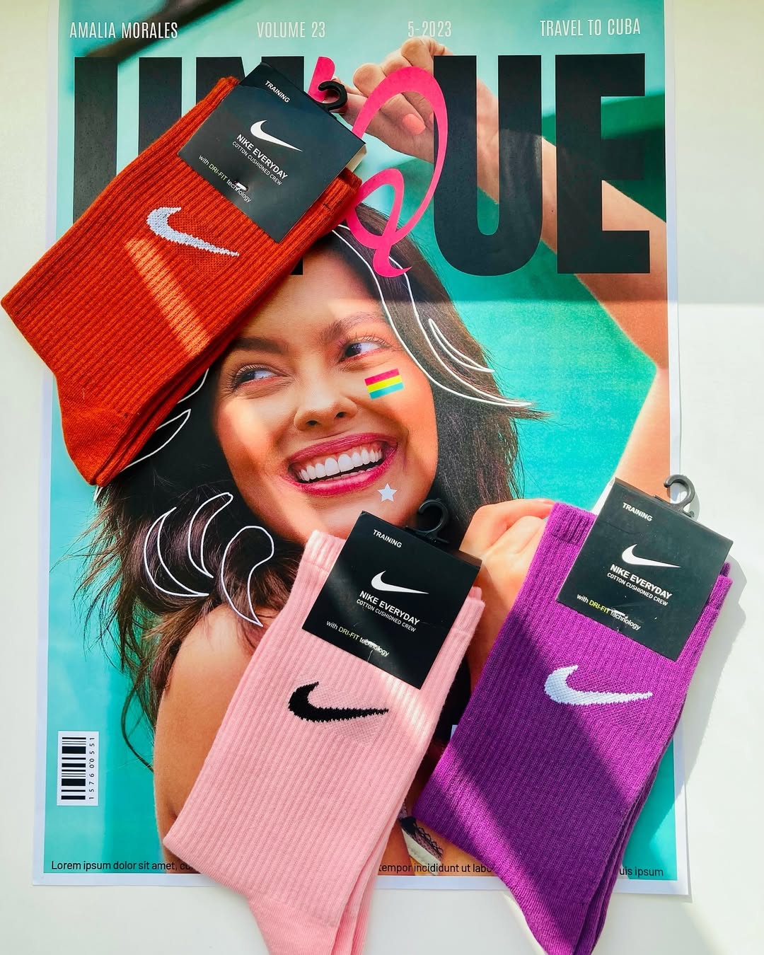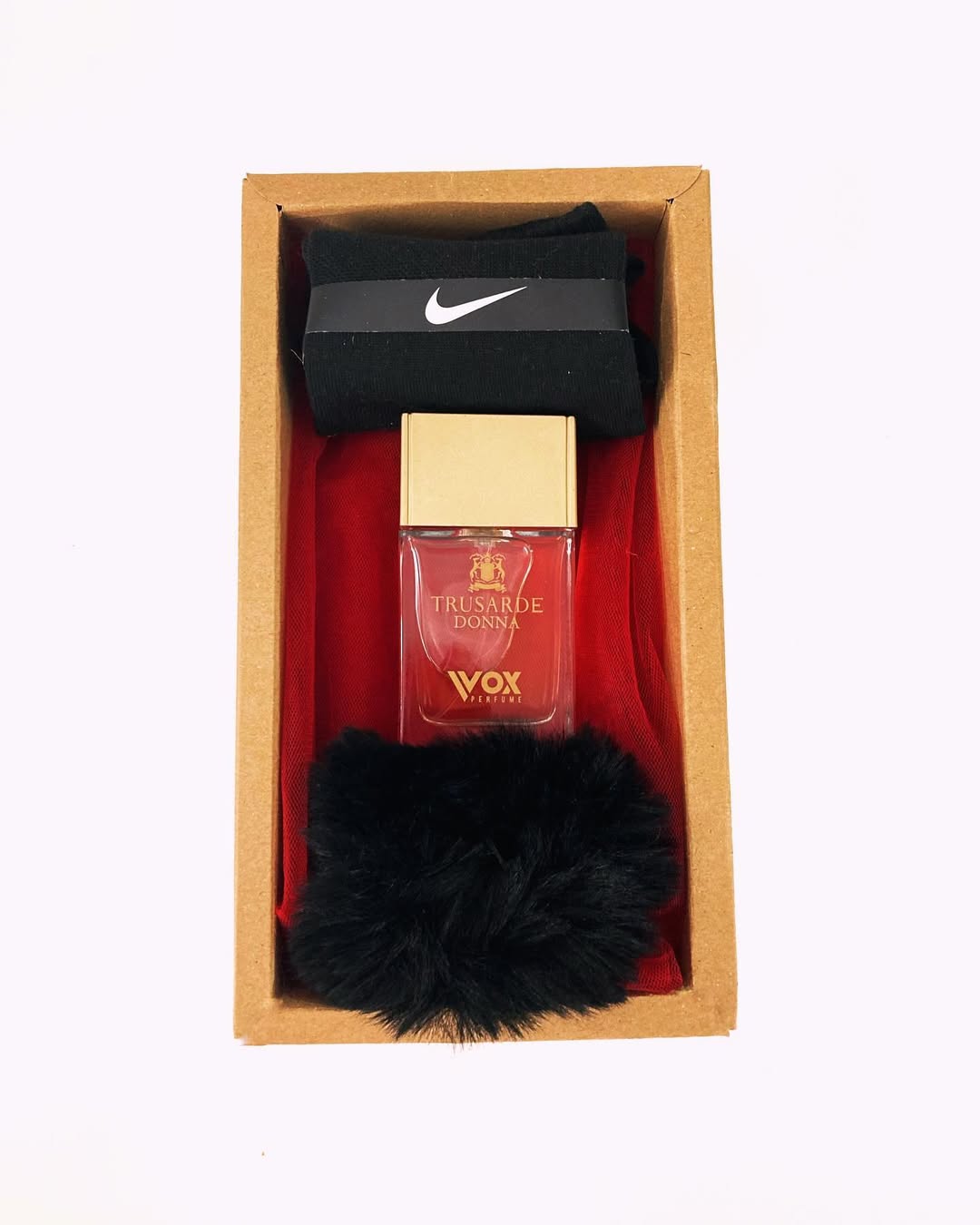 پک هدیه مخصوص خانمها شامل جوراب نایکی، ادکلن، شکلات، کش خز، لاک، جاسوییچی آکواریومی
